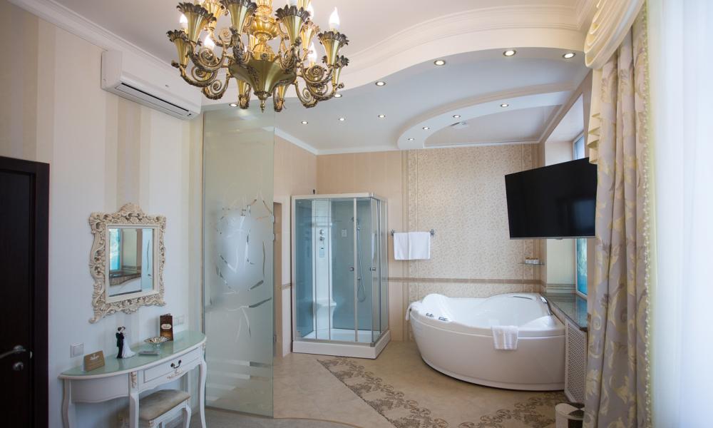Подарите себе роскошный отдых в изящном номере с большими окнами, свет из которых заливает все пространство. Круглая кровать, легкий балдахин, диван для чтений, джакузи, приятный комплимент в виде вина…Все это погружает в атмосферу любви и нежности. Номер общей площадью 65м2.